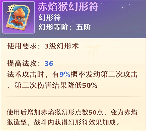 而赤焰猴幻形符则是法系输出门派不可多得的实用幻形符,其附带的【法连】效果有奇效。