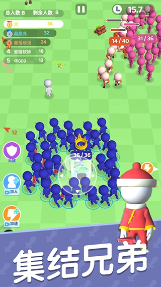 重度休闲游戏,开局一个人,队伍全靠组,率领你的兄弟们一起冲向重点,突破重重阻碍,清除一切出现在你面前的对手们,打败最终的boss即可成功通关,获得游戏的胜利。