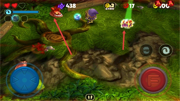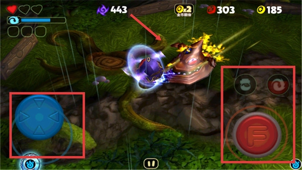 2、接着通过蓝色的方向盘来控制角色移动和红色的按键来攻击敌人;