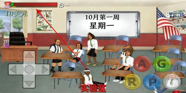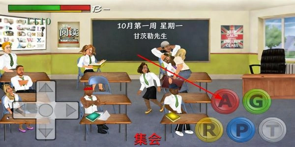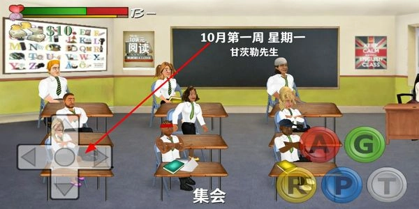 2、在教室场景中,通过操作移动按钮控制角色位置,调整到合适区域后,可触发与其他角色的互动行为。