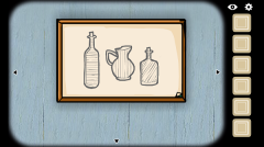 观察两幅壁画的内容,上面那幅画里有【横纹图案-酒瓶-红酒】、【竖条纹-水壶-水】和【斜纹-苦艾酒瓶-苦艾酒】这几组对应关系;接着参照下面壁画的内容,按顺序往桌子上的器皿里倒入【红酒】【苦艾酒】【水】【红酒】【苦艾酒】。