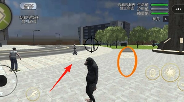 1、操控猿猴,沿箭头指向的目标(如骑平衡车的人)移动,利用左侧摇杆【调整方向】,靠近触发互动或任务。