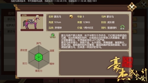 在游戏刚开始,系统会附赠一匹马儿。山有高低之分,马儿同样有品种和品质的差异,这就决定了马儿初始六维。