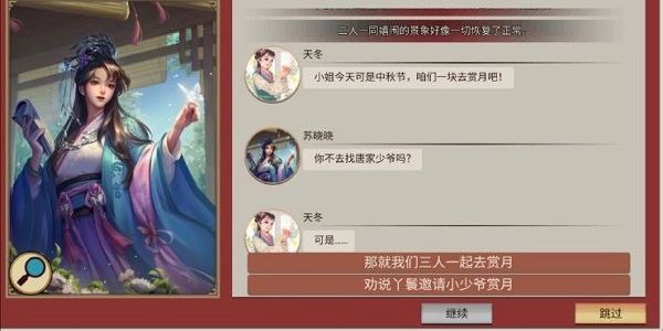 注意:最后一段剧情要是直接选答应,就不用和她老爸文斗了,能直接成老婆,两个选项结局是一样的!另外必须选劝天冬去邀请唐少爷,要是选三人行的话,游戏就结束啦!