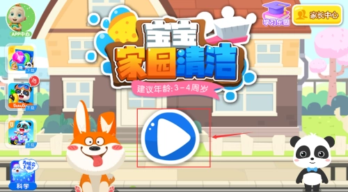 1、点击蓝白色播放按钮,开始宝宝家居清洁游戏。