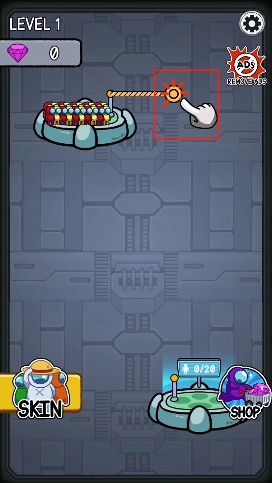 1、开局我们观察界面右侧手指指向的黄色圆形开关,点击该开关以松开连接的绳索,搭建起上方人群向下方输送的通道。