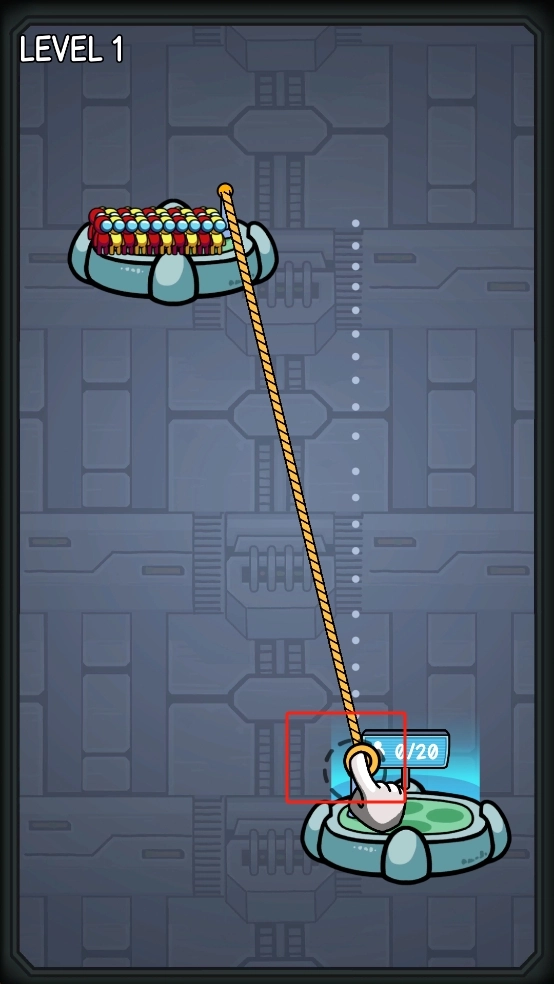 2、跟随指引拖动绳索末端的黄色圆环,将其精准放置到下方标有0/20字样的绿色平台区域,确保绳索连接稳固。