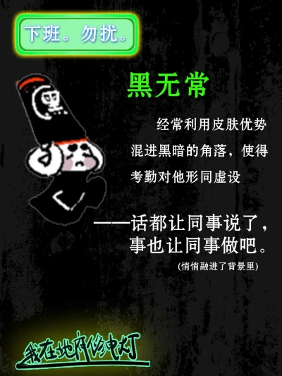 黑无常总爱仗着自己肤色的便利躲进昏暗的角落,考勤对他根本起不了作用——反正同事会替他应付考勤问话,工作也能推给同事去做。抱着这种念头,黑无常又悄无声息地隐入了周围的阴影里。