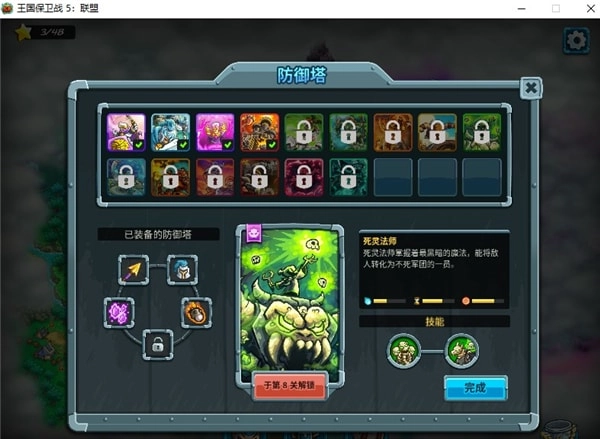 需要注意的是第三张地图不建议用岩浆坑和死灵法师来拦截,前者召唤恶魔随机且眼精机动性强,两者叠加随机性太高容易让人血压升高;后者生成骷髅的效率太低。推荐第三张地图用大树做拦截,死灵法师当副塔顺便负责法术输出,哥布林哨兵塔则用来拦截后期关卡的大怪。