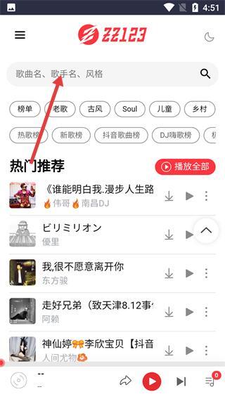 1、在软件主界面的搜索栏中,输入歌曲名、歌手名、风格等相关内容,即可触发音乐搜索功能,从而获取对应的音乐资源列表。