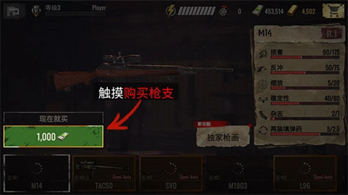 1、进入游戏后,玩家需要首先运用初始资金购买一把武器,点击画面左侧的现在购买;