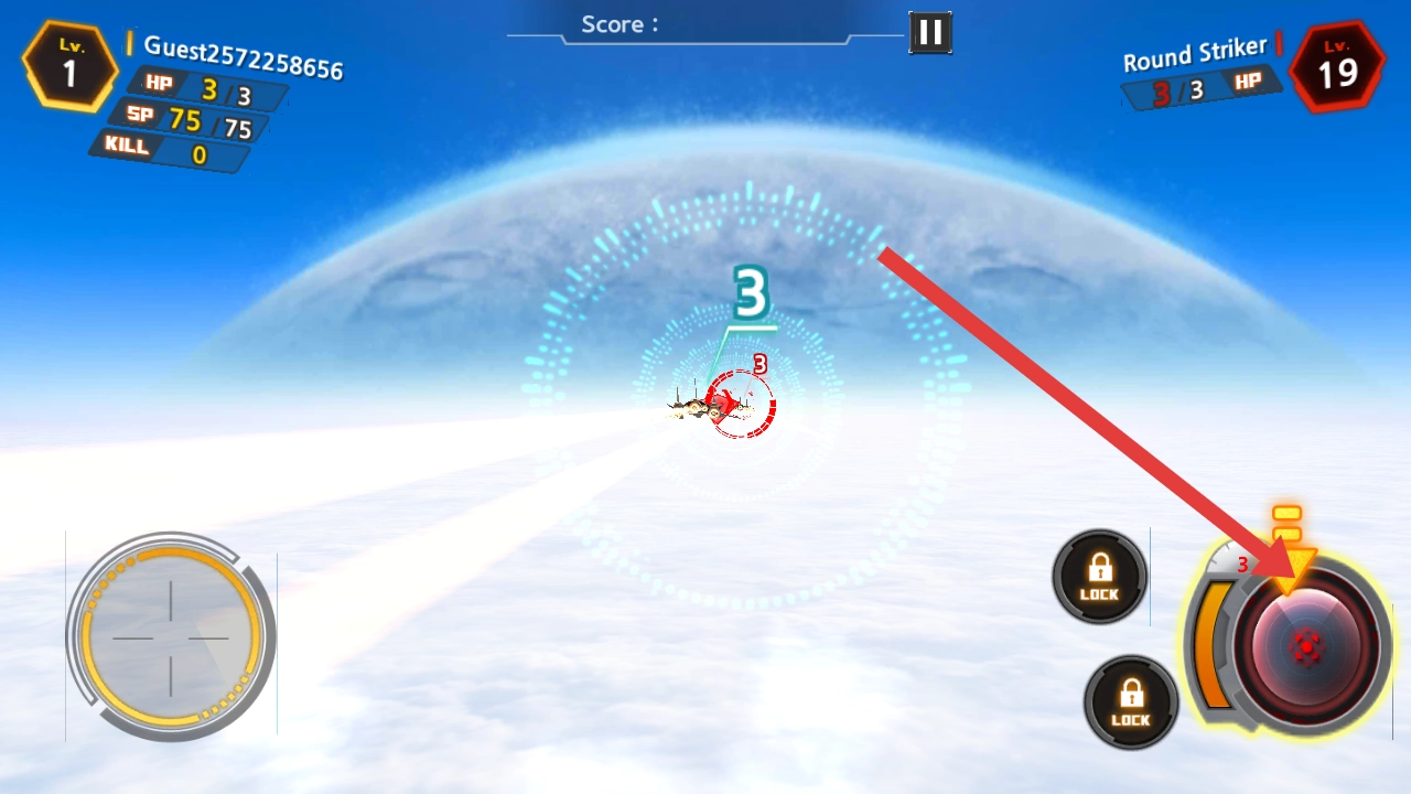 2、战斗阶段锁定敌机后,需要点击右下角发光的红色攻击按钮,释放火力打击敌方的目标。