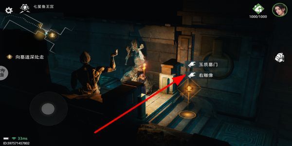 3、在场景中靠近互动元素,选择对应的解谜选项,与玉质墓门石雕像等物品交互,解锁后续探索区域。