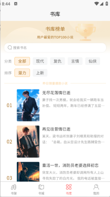 3、“书库”页面,对小说做了细致的分类,涵盖言情、悬疑、武侠等不同类型。
