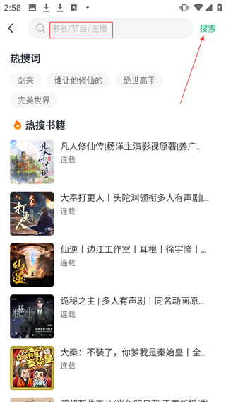 1、在应用首页点击顶部【书名/节目/主播】搜索框,进入搜索界面。