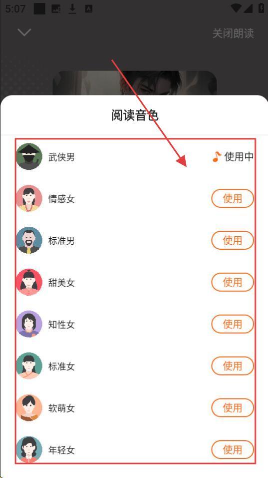 4、在朗读音色页面,有【武侠男】【情感女】等音色,选喜欢的点击【使用】即可。