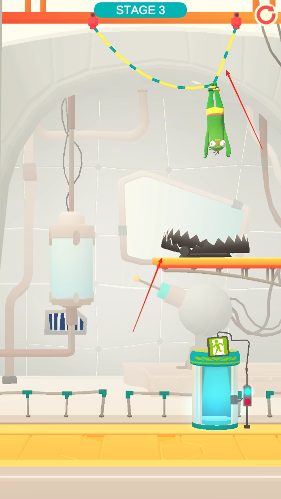 1、滑动屏幕将箭头所指的线切断,让僵尸远离下方的陷阱,从安全的地方降落,僵尸会自动走到离开的通道。