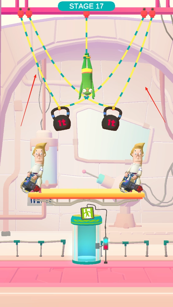 3、两个大锤石在空中绑着,将两边较短的先切断,让大锤石砸晕两个敌人,再将大锤石切割掉落在地,再让僵尸下来,即可安全到达出口。