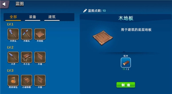 3、收集完资源后,大家可以点击小锤子图标打开蓝图,先制作一块木地板。由于工作台等建筑需要放置在木地板上才能使用,因此务必先在地面铺设木地板。