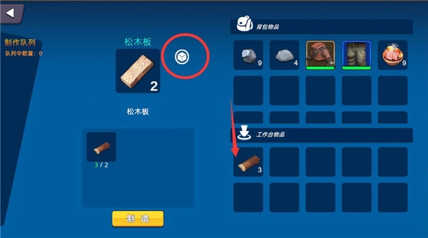 5、工作台的使用方法如下:首先点击物资,选择将其放入工作台的储物箱;接着点击左侧你想要制作的物品即可开始制造;制造完成后,点击那个白色图标,就能取出工作台已制作好的物品。
