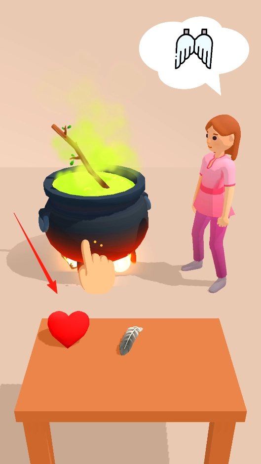 2、拖动心脏投入药锅,按提示收集材料将心脏放进药剂,推进炼药步骤,体验材料投放机制。