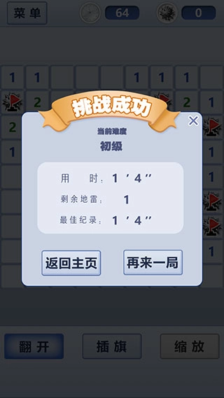 4、玩家只要找出所有隐藏的地雷,即可挑战成功,结算界面也会展示玩家最终的成绩。
