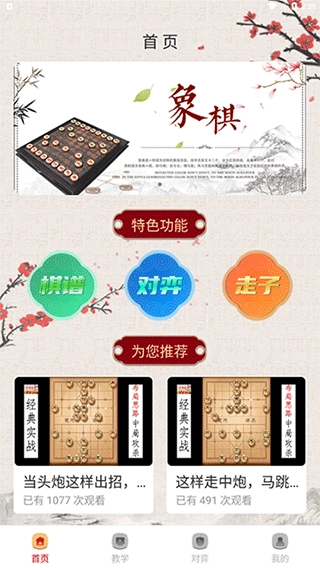 进入首页后,能看到三个特色功能,分别是棋谱、对弈和走子。