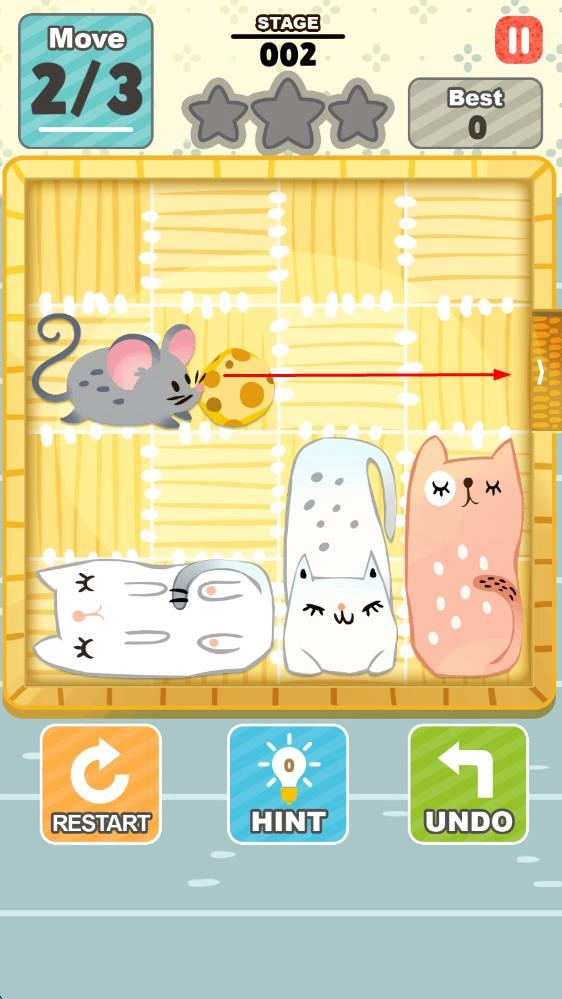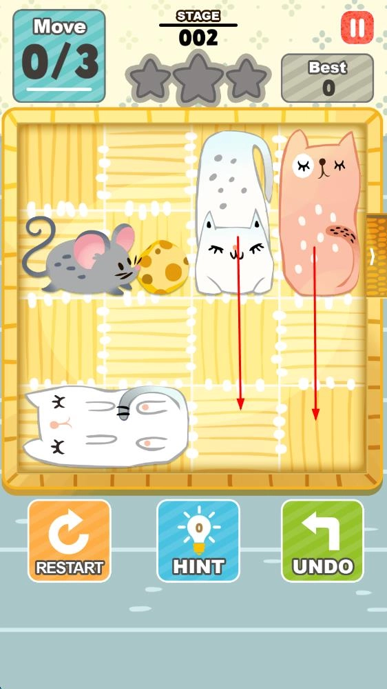 2、关卡深入后,猫咪分布更复杂,可使用特殊道具或等待免费提示,在不惊醒猫咪的前提下,逐步谜题,帮助小老鼠持续突围。