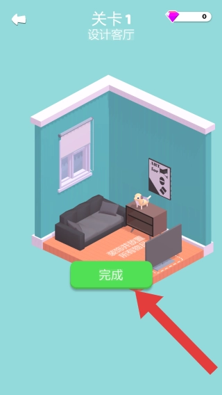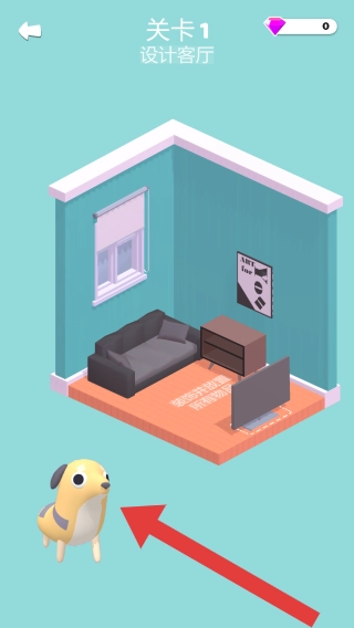1、目前处于关卡1的场景,需要根据提示设计客厅的布局,拖动下面的物品到正确的位置。