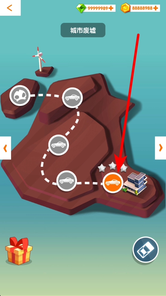 进入关卡地图后,你会看到上面分布着多个节点,每个节点对应着不同的关卡。点击对应的节点,就能进入相应关卡开启紧张刺激的赛车竞速,在城市废墟这类场景里尽情展示你的驾驶本领。