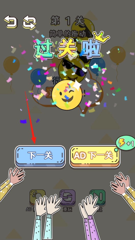 2、看到“过关啦”的彩色字样就代表你顺利通过了,戴着墨镜的卡通头像会为你庆贺;要是想继续挑战,就点击蓝色的“下一关”按钮;黄色的AD按钮可以让你额外获取奖励,不过需要观看广告才行。