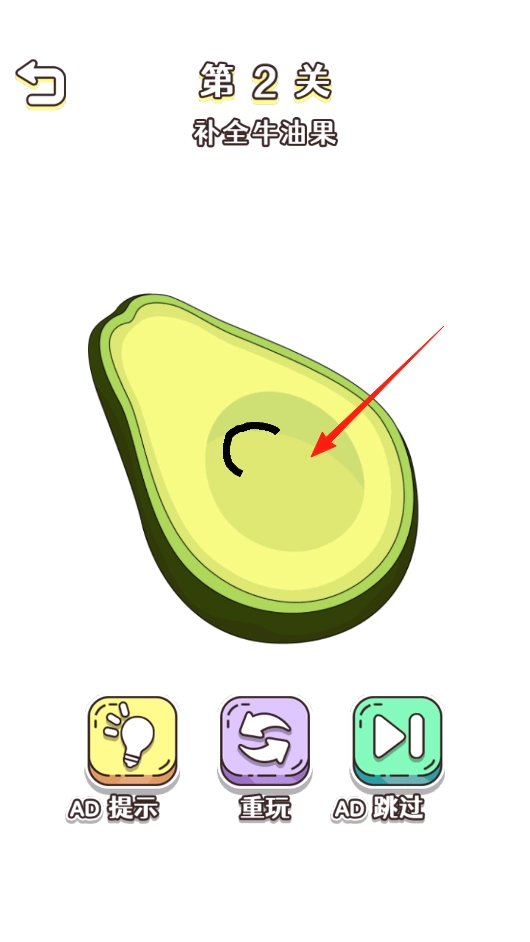 3、这次要把缺失的牛油果部分补上,红色箭头会提示需要修补的位置,用提示按钮可以查看参考答案,重玩按钮能随时重置当前关卡进度。