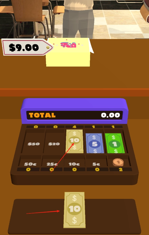 3、等所有商品都完成装饰和装盒后,到收银台点击一下就能把顾客的钱收入收银机,上方会显示需要找的零钱;要是一块钱不够找零,可以把旁边的整钱拖到一块钱的格子里,整钱就会转换成一块钱。