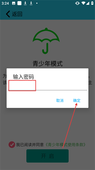4、在【输入密码】弹窗中输入密码后点击【确定】,即可完成青少年模式的设置。