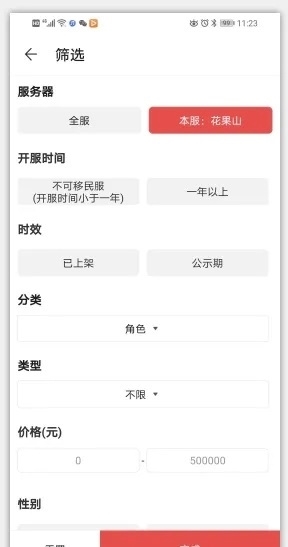 3.要是对角色的区服有指定需求,可点击右上角的筛选按钮,进入筛选界面后选择对应的条件进行筛选,最后确认就可以了。