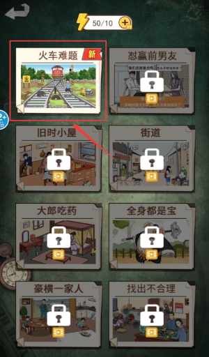 4、点击红框火车难题卡片,解锁第一关游戏内容。