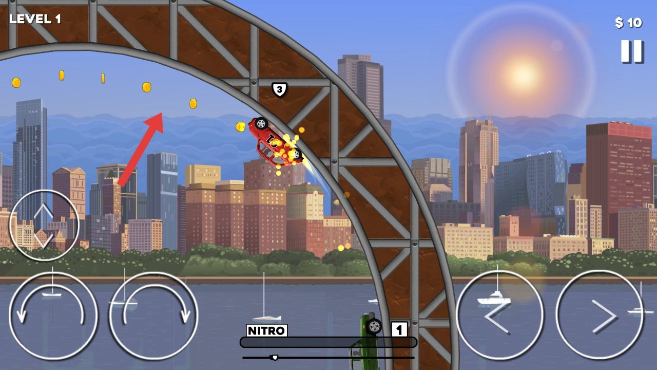 2、当车辆行驶到拱桥处时,要找准时机收集空中的金币,同时通过操作来保持车辆的平衡,从而顺利驶过拱桥地形。