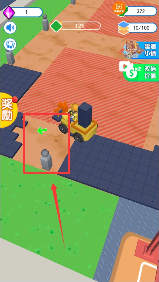 4、移动到红色框框指示空旷位置上堆放砖块。