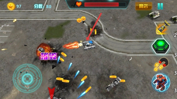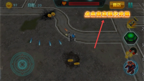 1、战斗中,点击上方商店,可进入强化界面,消耗金币提升武器威力,增强了坦克战斗的能力。