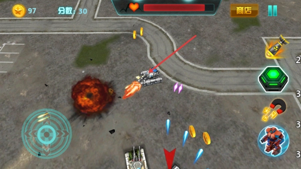 2、操控坦克沿道路行驶,利用射击键攻击敌人,注意躲避炮火,拾取路上金币,积累资源用于强化。