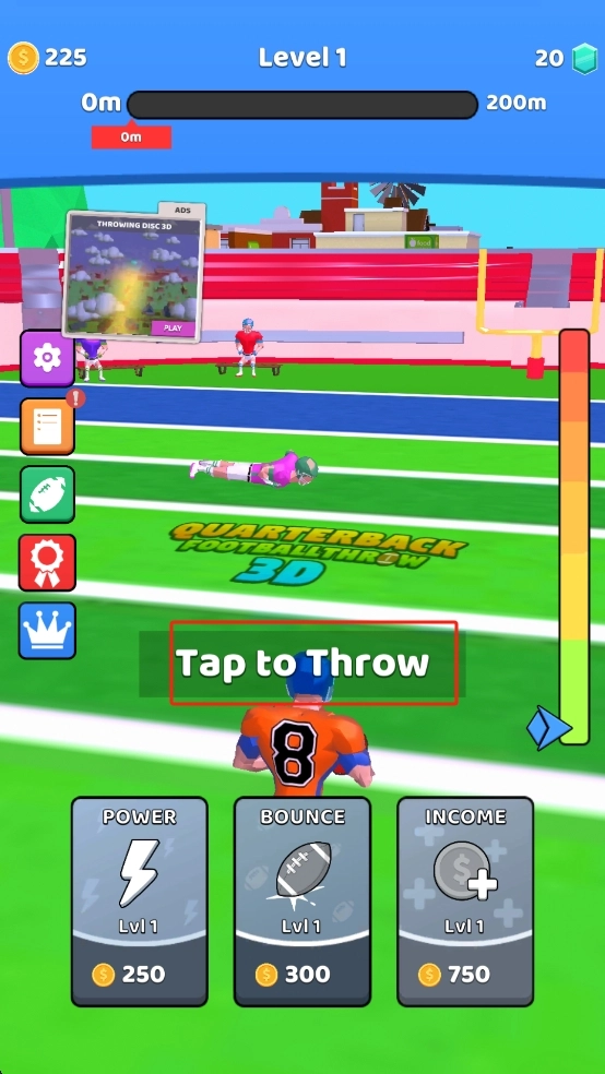 1、游戏开始时,我们长按屏幕蓄力来控制投掷力度,等右侧能量条达到峰值时松开手指,就能把橄榄球投出去,尽量让它飞得更远。