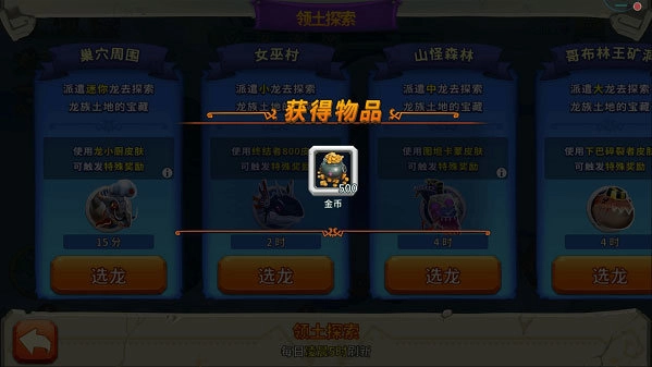 4、探索结束后,左下角会弹出领奖提示,点击该提示进入页面即可领取奖励。奖励包含:金币500至10000、宝石2至25,以及福利龙蛋、高级龙蛋。