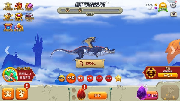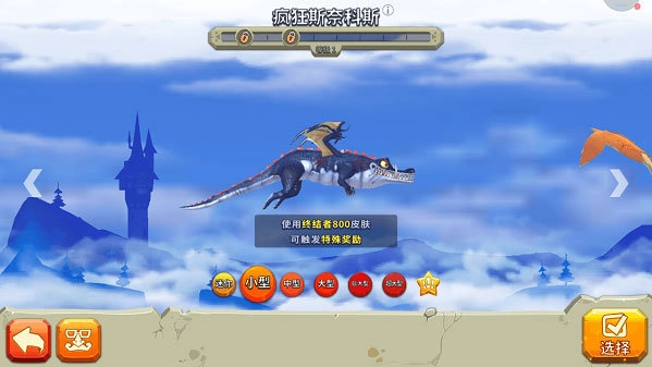 2、进入领土探索界面后,就能按照任务要求挑选龙、皮肤和宠物,可参与的龙尺寸包含:“迷你”“小”“中”“大”“巨大”“超大”