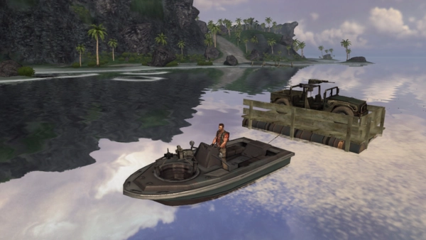 接到神秘人的电话,让我仔细找找漂亮MM的下落。嘿!就算你不说我也得找她啊,我的钱可不能打水漂,那可是一大笔呢!说真的,我在这岛上待了几十年,还真不知道这荒岛旁边居然有这么一艘破旧的大船。船上已经被神秘武装分子当成基地了,我得小心点……从船舱一路打到甲板,打到这儿大家应该对这游戏的AI有不少了解了:远处的敌人要是听到这边有枪声会循声过来,还会用包围战术,绝不会傻站着等你爆头;要是你受伤了回去找医药包,敌人也会跟踪过来追杀你……杀了一个敌兵士官,在桌上发现了Valerie的随身东西:证件、相机之类的,但没看到她人,难道出事了?!我顺着梯子准备上甲板,突然船舷边飞来一架敌人的武装直升机,机枪子弹猛扫过来,压得我不敢上去。这里有两种上去的办法:第一种是高手玩法,冲上甲板后赶紧躲到箱子后面,先干掉后面的机枪手,不然会被前后夹击;然后对着直升机猛开火,甲板那边的敌人暂时威胁不到我,最后直升机就会起火爆炸。第二种是保守打法,适合新手用:敌机飞过来的时候别往上冲,反而下到第二层,在船边用枪打直升机,直到它爆炸!这样甲板上的敌人就不会对你怎么样了。把直升机打掉后再上甲板一个个收拾,走过晃晃悠悠的吊桥,找到黄色冲锋舟。要是跳上去会提示需要钥匙,别管它,直接用枪把绳子打断不就行了?回头看了看刚才拼死战斗过的大船,然后驾着冲锋舟向西海岸去了……