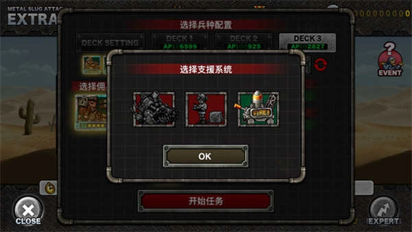 这是游戏的出战界面,顶部设有deck卡组编辑与deck选择两个功能选项。界面下方的10个格子用于展示当前deck的单位配置,在这十个单位栏的后方是支援系统模块。点击该模块会出现三种支援选项:其一为爆车攻击(机制与合金弹头正统作品中的载具自爆相近);其二是医疗支援,效果为场上所有友军单位恢复全部生命值,同时重置所有友军单位的建造冷却时间;其三是填充支援,能让场上所有友军的特殊攻击立即完成准备。玩家需在开战前依据自身战术需求选定支援类型,进入战斗后将无法更改。