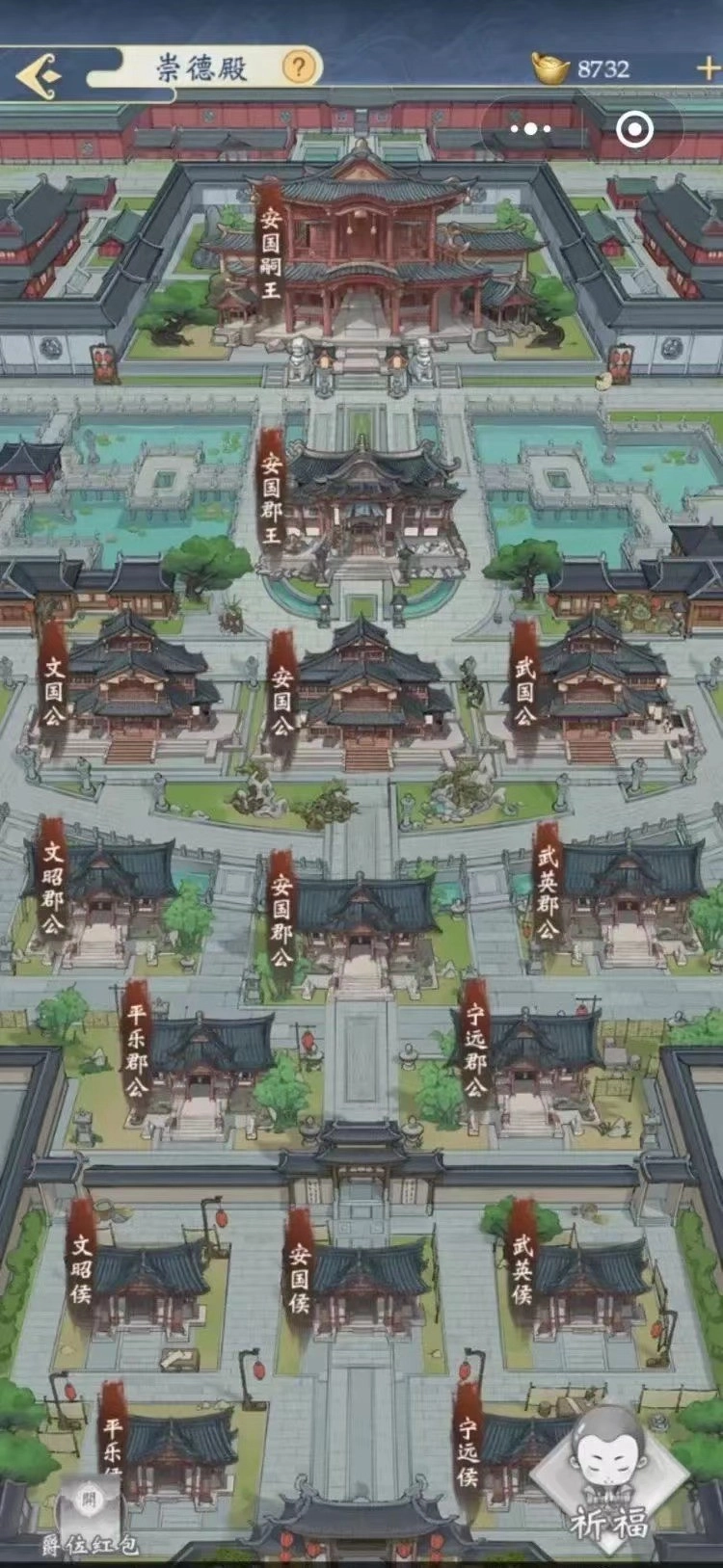 崇德殿祈福每日能够得到20元宝,点开有爵位的房间还能膜拜获得额外50元宝;