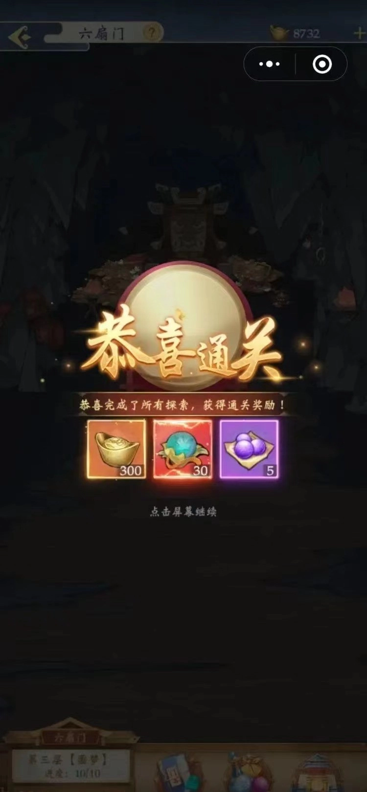 六扇门是比较重要的元宝获取点,通关单层即可获得对应奖励;全部通关共计会得到600元宝的奖励。