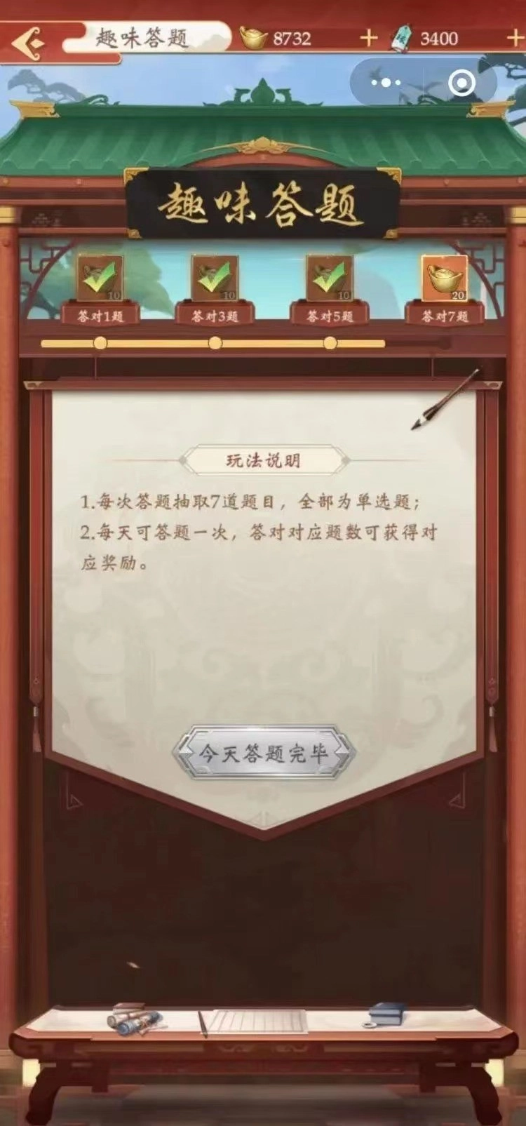 碰到相国寺活动时,可以每天进行答题。每次答对七道可以获得50元宝。
