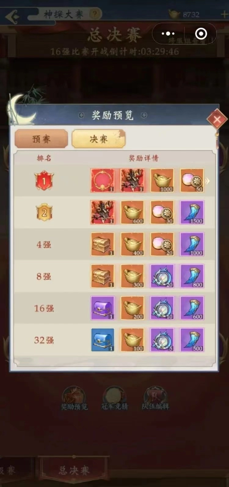 神探大赛晋级前32强就会有元宝奖励:冠军1000、亚军600、四强400、八强300、十六强200、三十二强100。