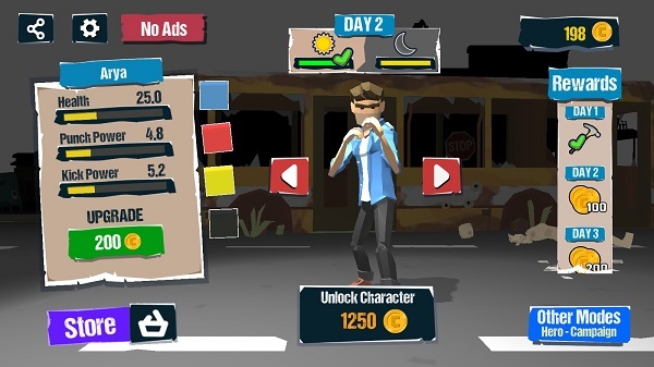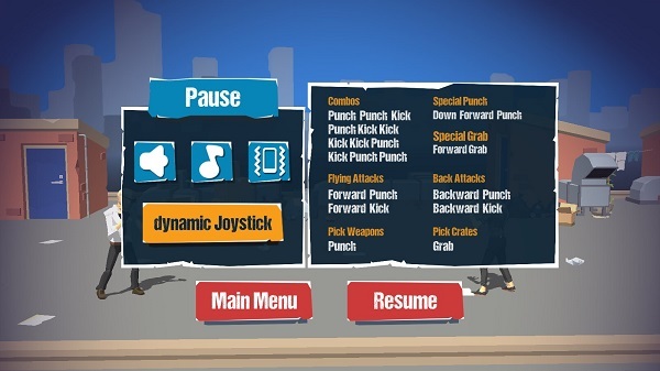 游戏采用闯关模式设计,随着关卡推进,对手的出现位置会更具挑战性,强度也将逐步提升。当前游戏提供白天与黑夜两种作战场景:白天场景的对手强度相对较低,玩家可以在此阶段专注练习格斗技巧,熟练掌握各类连招的使用方式;而黑夜场景中,对手的整体强度有了显著的质变,部分敌人还会携带棍棒、刀剑等武器,并且除玩家所在区域外,其他区域会被“迷雾”笼罩,大幅增加了挑战难度。 玩家通过闯关积累的金币,既可以用来解锁新的游戏角色,也能够用于提升当前使用角色的各项能力数值。关于连招的具体组合方式,玩家在进入游戏后点击暂停按钮即可查看相关说明,但仍有部分连招需要在实际战斗过程中自行探索和掌握。如果是喜欢街头格斗风格、追求强烈动作打击感的玩家,这款游戏绝对值得一试!
